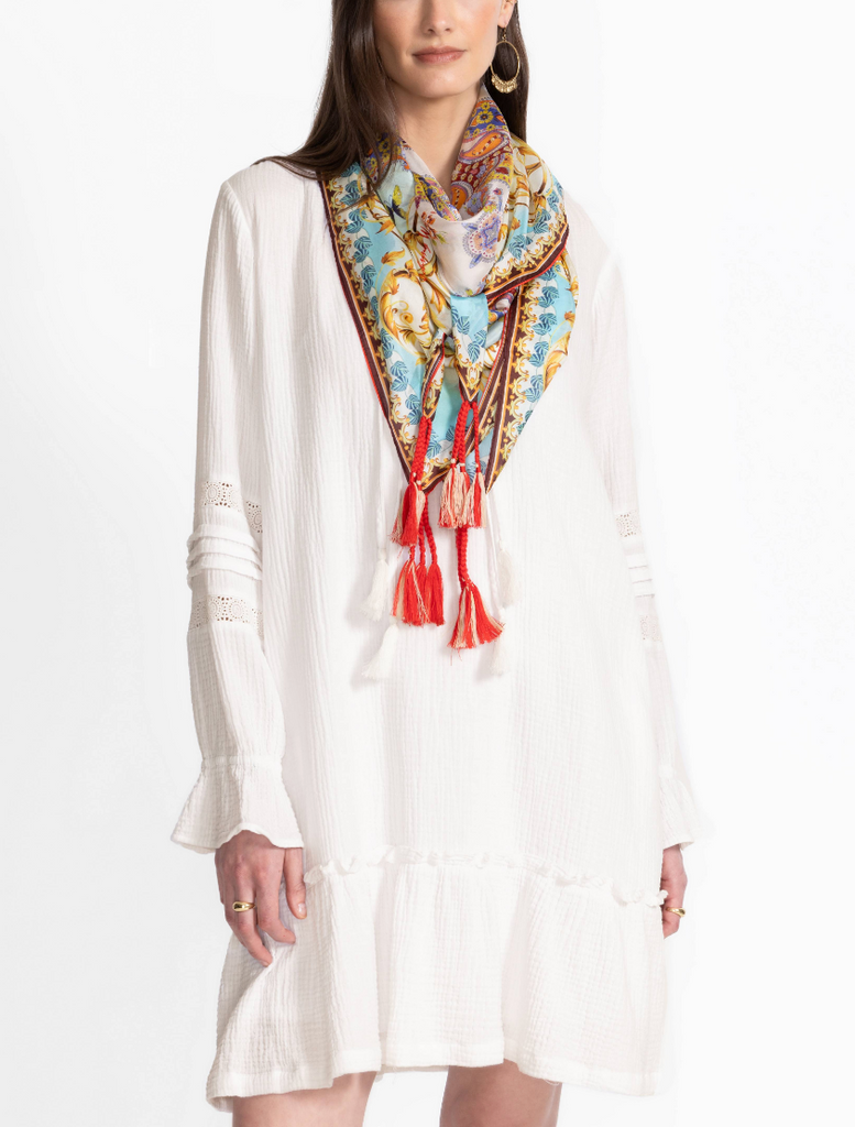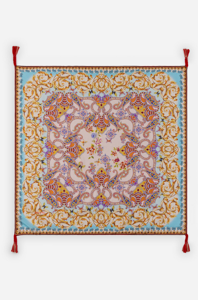 Crafted from luxurious 100% silk, the Scroll Silk Scarf is adorned with a beautifully rich pattern in vibrant tones. Thoughtfully designed to enhance any look, this square scarf is finished with tassels at each corner for added texture. Tie at the neck or at the handle of your favorite back for a pop of color.