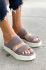 The Seaview sandal is a two-strap slide elevated on a creamy white EVA flatform. Stretch leather.