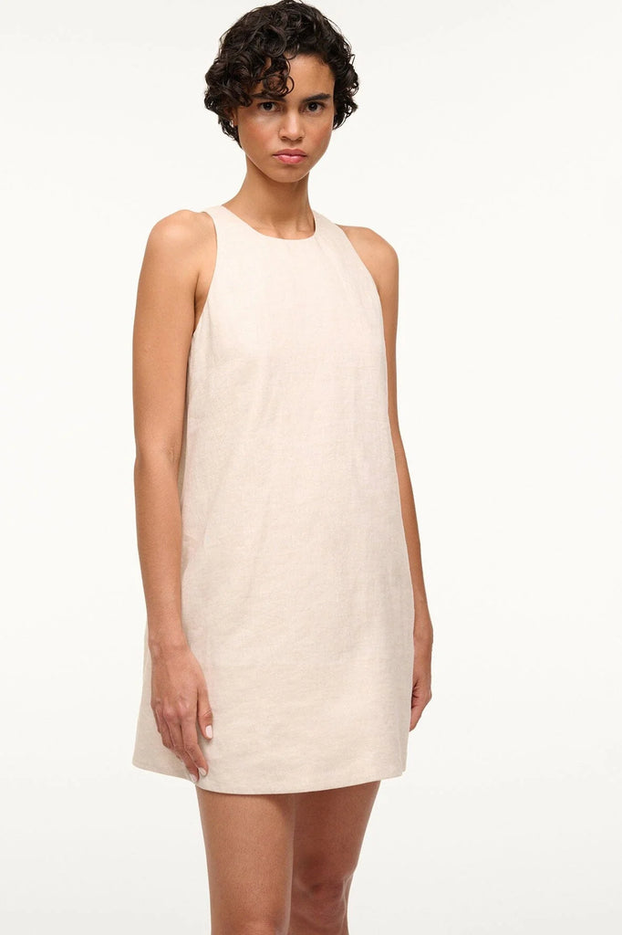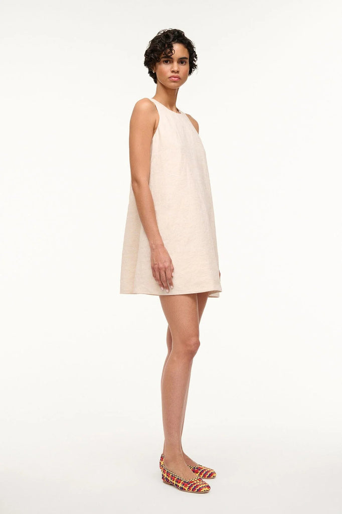The Serafina Dress is a flowy, A-line mini with a crew neckline and button closure at the back.