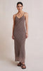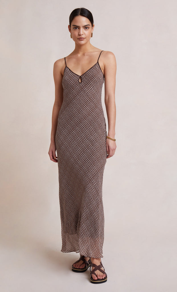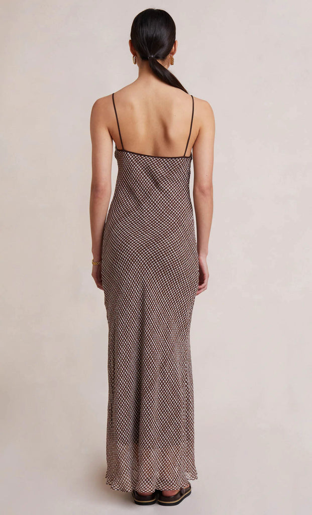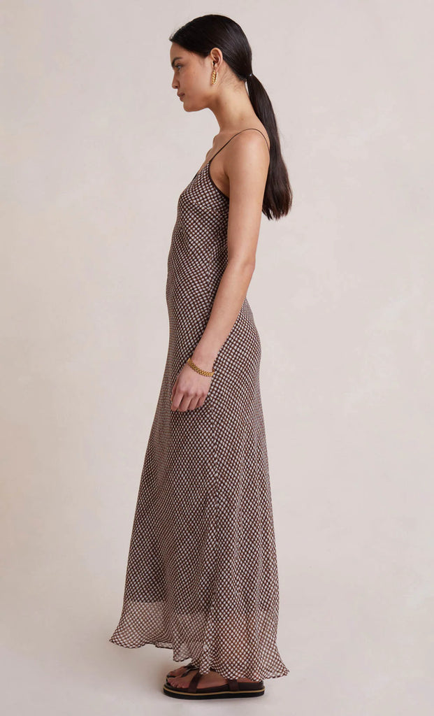 The Sherry Maxi Dress is cut on the bias for a flattering feminine silhouette. The maxi length dress is spun from a signature check print silk fabric with a V-neckline accented by a keyhole cutout detail and thin rouleau straps.