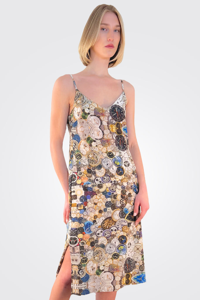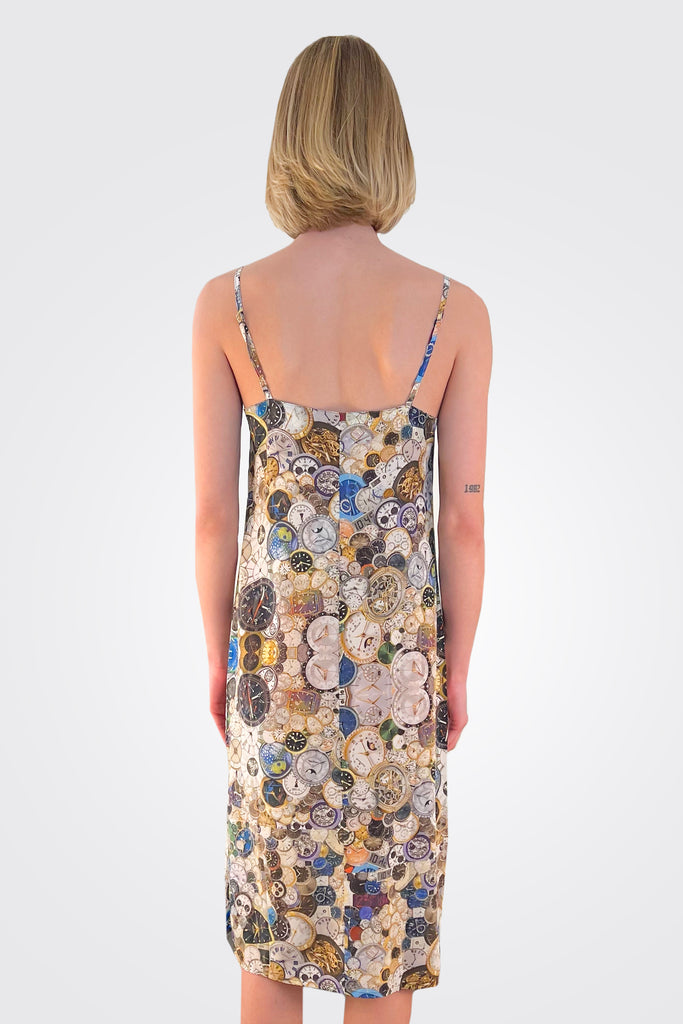 Printed silk Unbreakable Evolution dress with spaghetti straps. The dress features watch print on this slim fit silhouette. Round v neckline, and side slit.