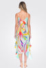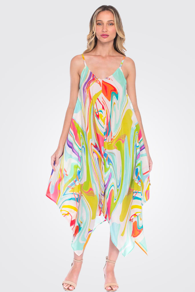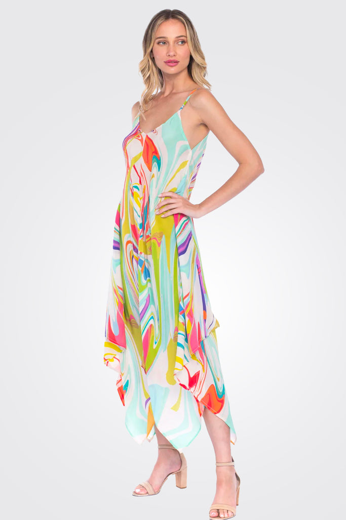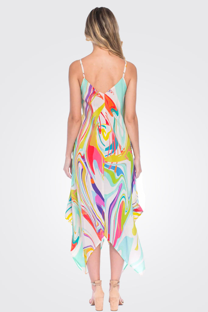 The Drew dress is designed and cut to create beautifully elegant drape on the body. Tonal, neutral shades are artistically layered with vibrant, bright colors creating an exciting Spring pallet
