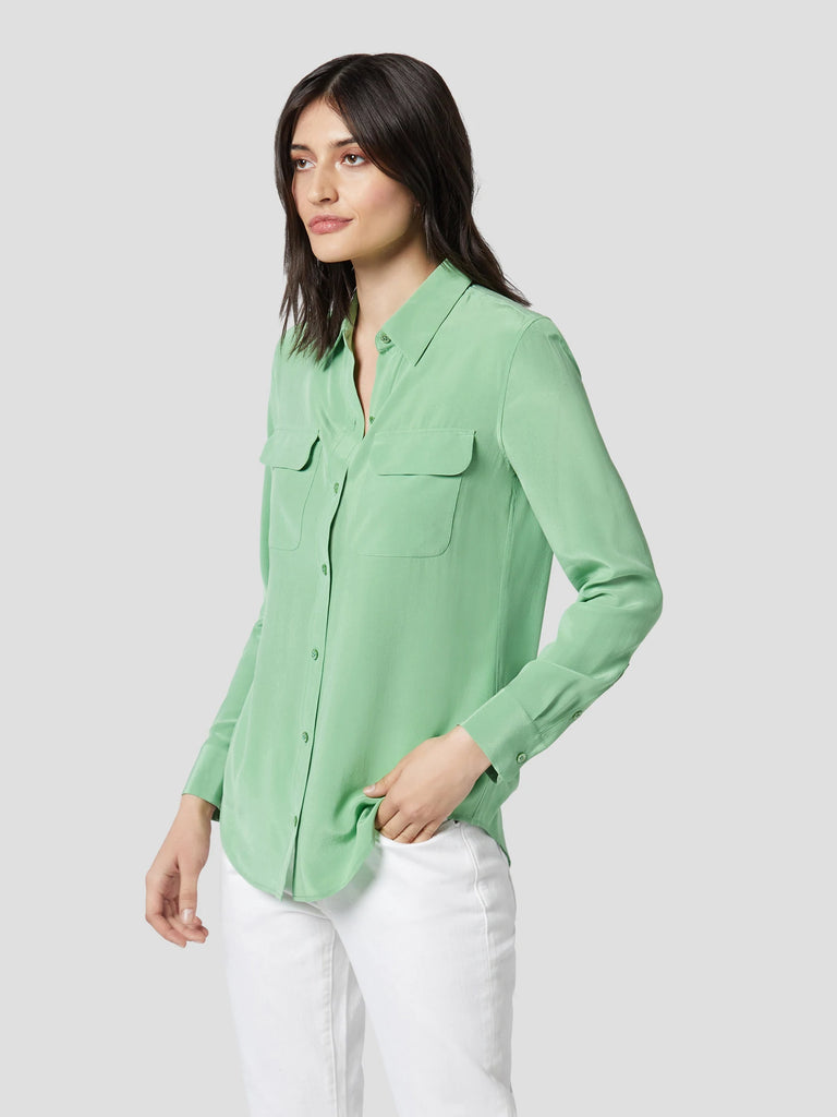 Equipment’s iconic Signature Shirt in soft sandwashed silk and a slimmer cut with two front pockets.