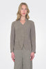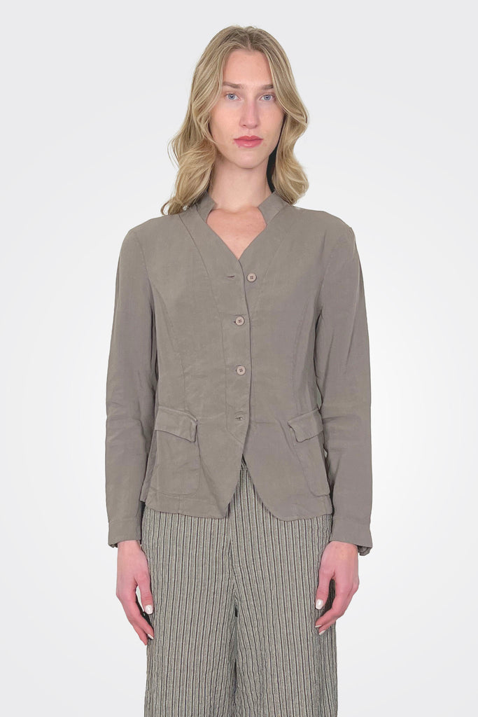Short, unlined, and slightly tailored jacket made of a linen-viscose blend. The piece features front and back vents, a band collar with shaped buttons, and front patch pockets with flaps. Dyed.