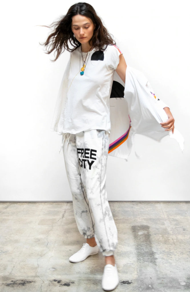 Unisex SUPERBLEACHOUT POCKET sweatpant with custom bleach wash process (highs and lows), classic “FREECITYlarge” print in black with cream "DOVE," elastic waist with pull drawcord, slant hip pockets and patch back pocket.