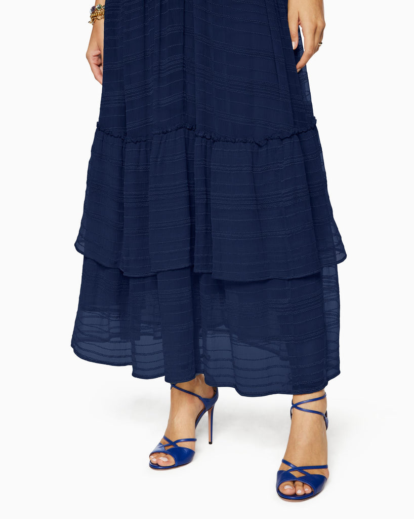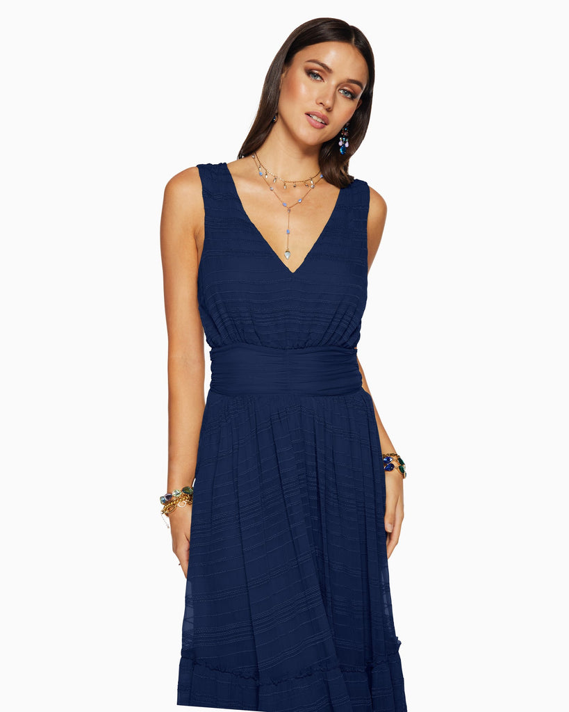 The Tate Dress is a seasonal staple that will instantly become a timeless go-to in your wardrobe. Featuring textured stripes, a belted waist, a billowy, tiered skirt, and a flirty deep v-cut in the back, pair this midi-dress with a jacket for a breezier day or on its own with strappy sandals for a stroll around town.