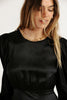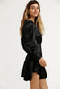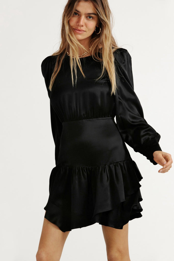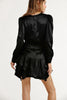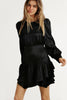 Get gussied up in the Teyana Dress, extra special in 100% silk charmeuse. This swishy party dress is both classic and playful with a circle neck surrounded by decorative buttons at the shoulders, shirred blouson sleeves and buttoned cuffs. Below a shirred high waist seam, the skirt flares to a shirred flounce with layered hem at bottom. Functional buttons line the center back.
