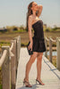 Black bubble hem strapless cocktail dress with dropped waist and braided detail.