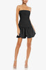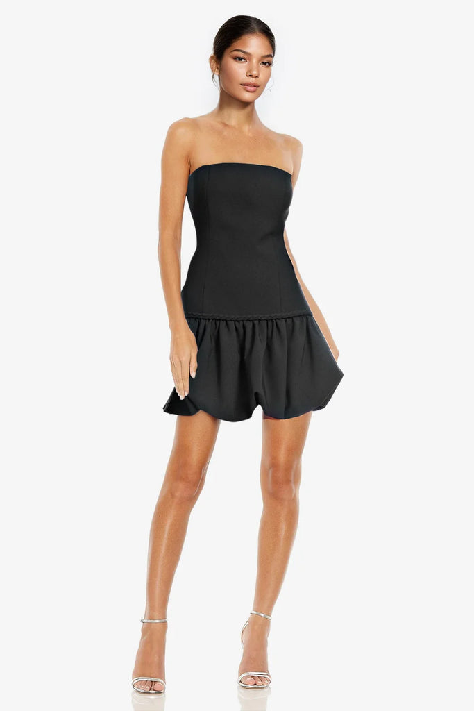 A darling black strapless mini dress that's as cute as it is flirty. With its bubble-hem, drop waist, and satin crepe composition, it's flattering in all the right places. Its timeless classic silhouette is chic through and through, with a thin braid along the dropped waist seam being the perfect modern touch. A refresh on the classic LBD. From cocktail parties to nights out on the town, look and feel your most playful self. Introduce your wardrobe to its newest staple: "The Brielle".