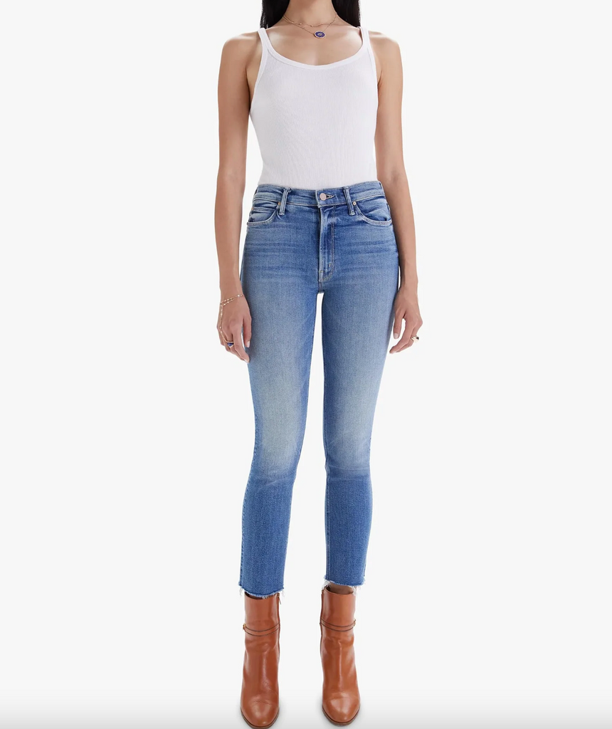 A real cliffhanger. Mother's most popular mid-rise straight leg with an ankle-length inseam and a frayed hem. Crafted from vintage-weight stretch denim in a retro-inspired wash.