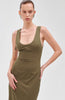 In a rich military green hue, this dress features a fitted bodice that defines the waist, flowing into a soft A-line shape. Crisp tailoring enhances its structured elegance.