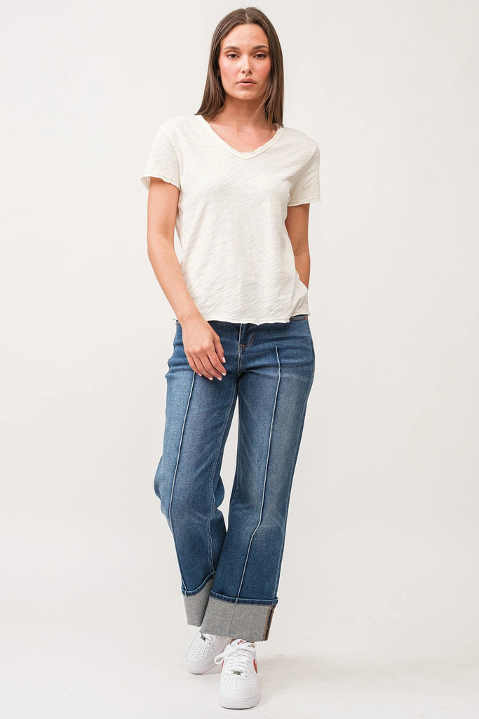 Short sleeve slub tee, v-neck with raw edges & patch labeling. The trendy piece that radiates your flair in soft & texture fabric, with a vintage wash touch... Solid color knit on relaxed fit.