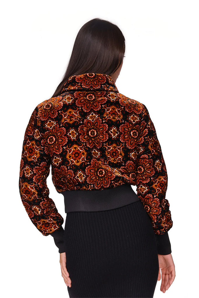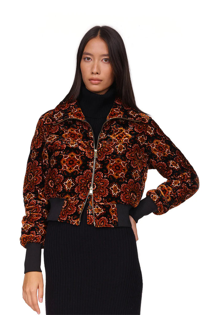 The Vos Jacket channels Steve McQueen cool with an elevated, feminine feel. The classic bomber is reimagined in luxurious, medallion-printed silk velvet that begs to be touched