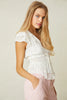 The Warden Top arrives in a 100% silk georgette fabric. This fitted v-neck blouse features romantic flutter sleeves, an angled waist yoke with textural smocking, flirty peplum layers, a strap tie at the front, and a side seam zipper opening.