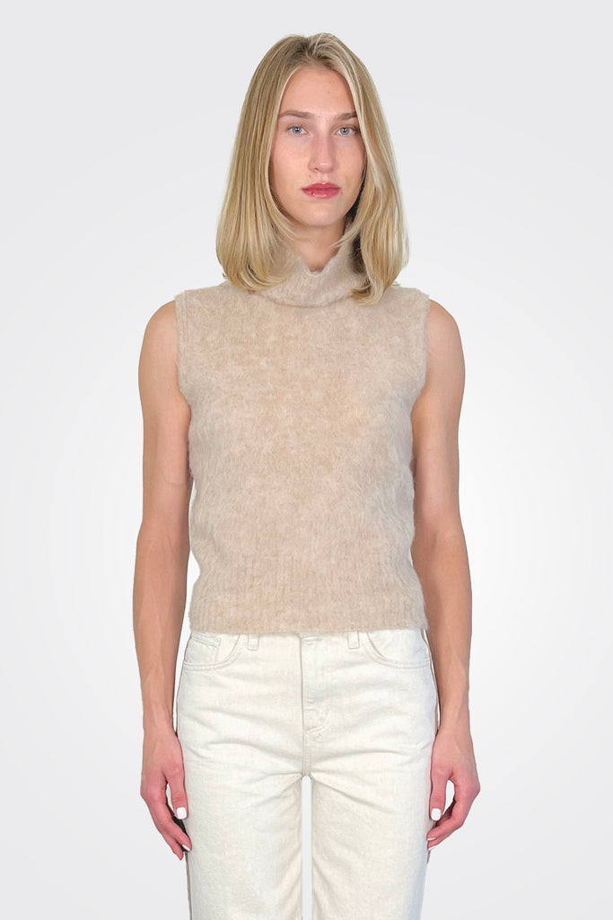 Lightweight soft fuzzy alpaca sleeveless turtleneck pullover top